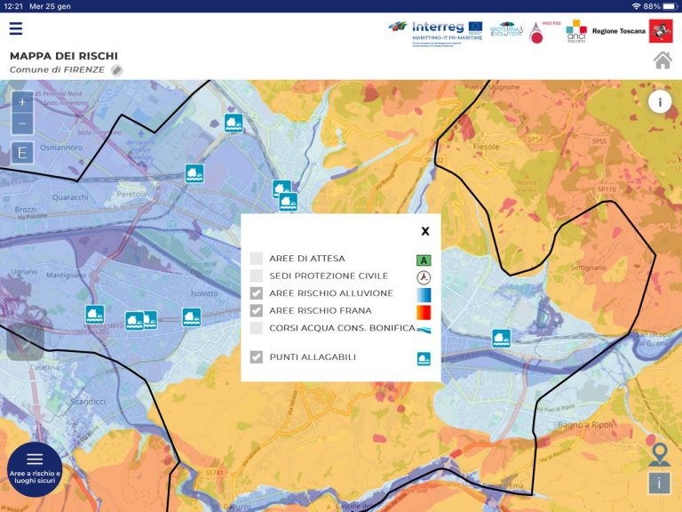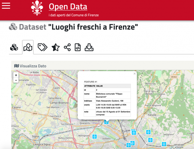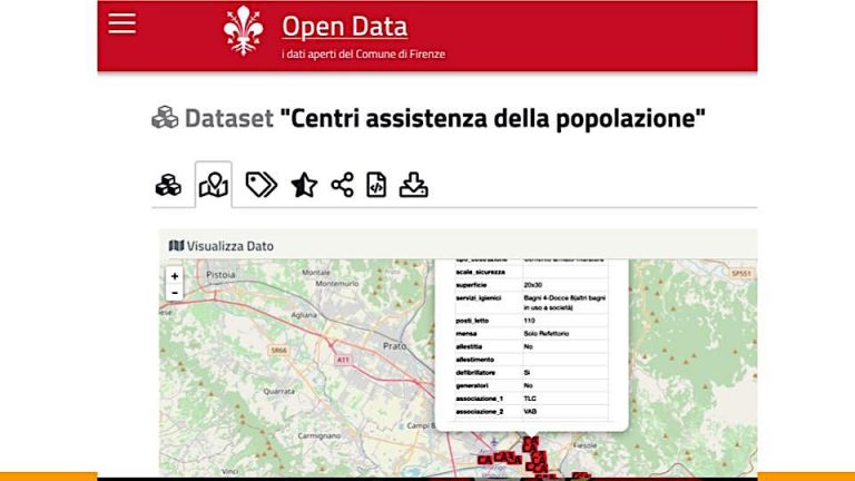 Typically, a city like Florence has an open data program. This example is for the second “emergency classic:” earthquakes. This shows you where the emergency shelters are.