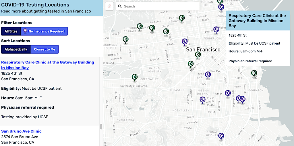 The city government offers the most complete map of public and private testing sites with info pop-ups on eligibility and drop-ins (great if you’re on a smartphone) built on open-source tools.