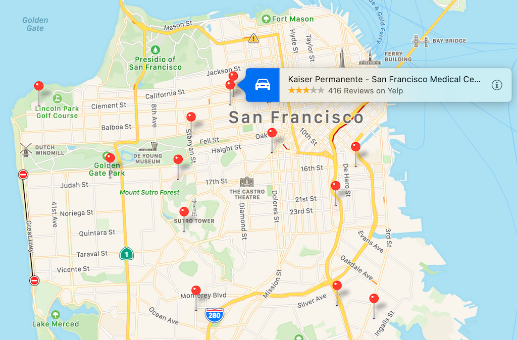 In San Francisco, Apple maps offers a very slim roster of sites, most of them hospitals. How many folks who live here need a list of hospitals?