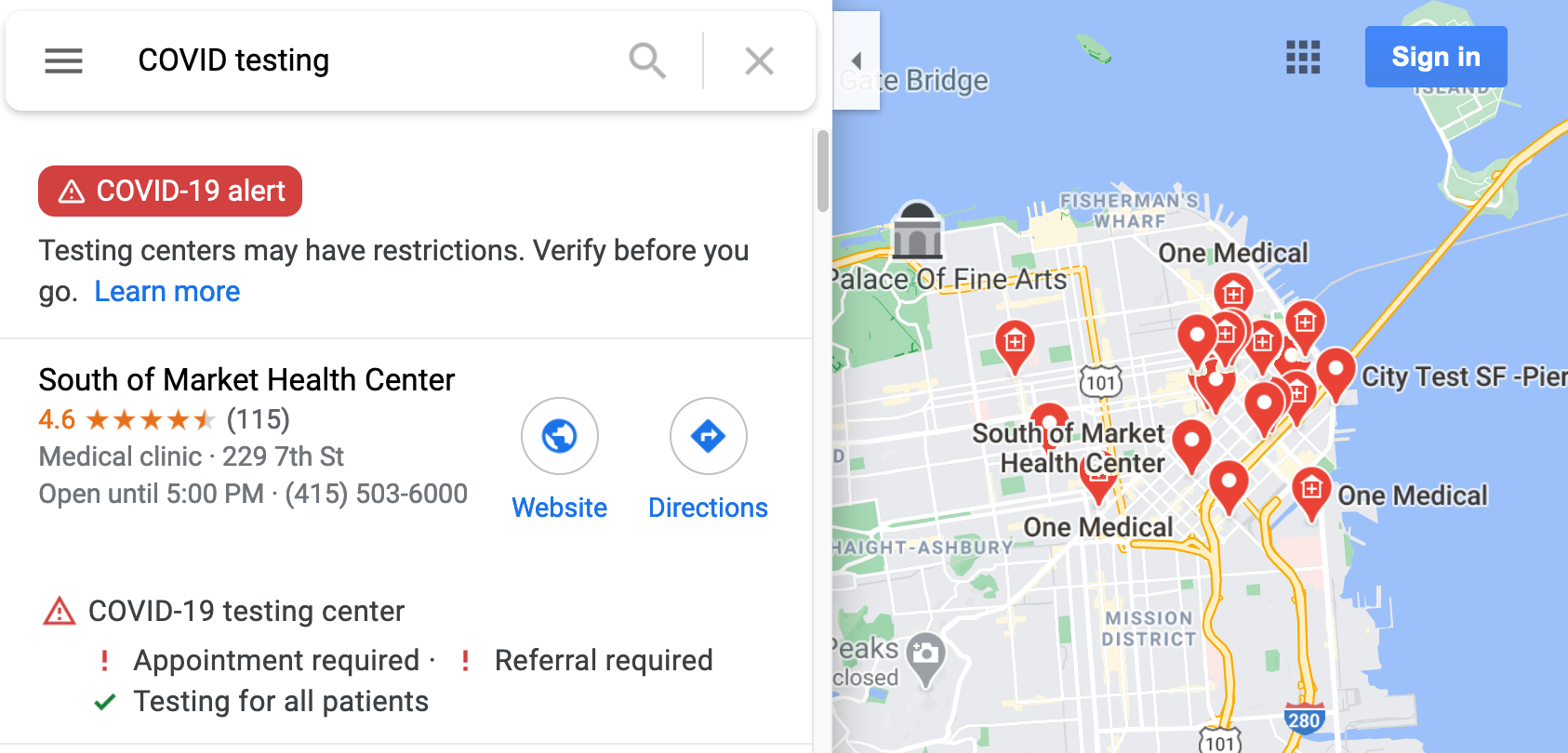 Google maps does a better job of including labs and private medical practices along with the city testing sites, but relevant information about booking, eligibility and price only pop up on the sidebar, making it more or less useless on a mobile phone.