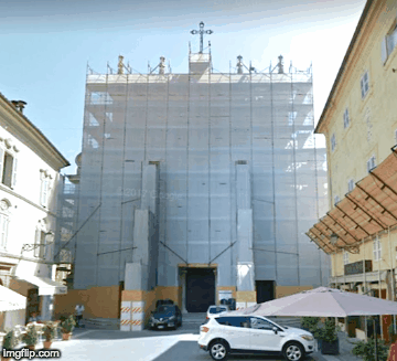 Now picture that facade — fruit of masterful tinkering from the early renaissance up until completion in the 1700s — wrapped in white scaffolding with only the cross protruding from the roof after damages from the 2017 quake.