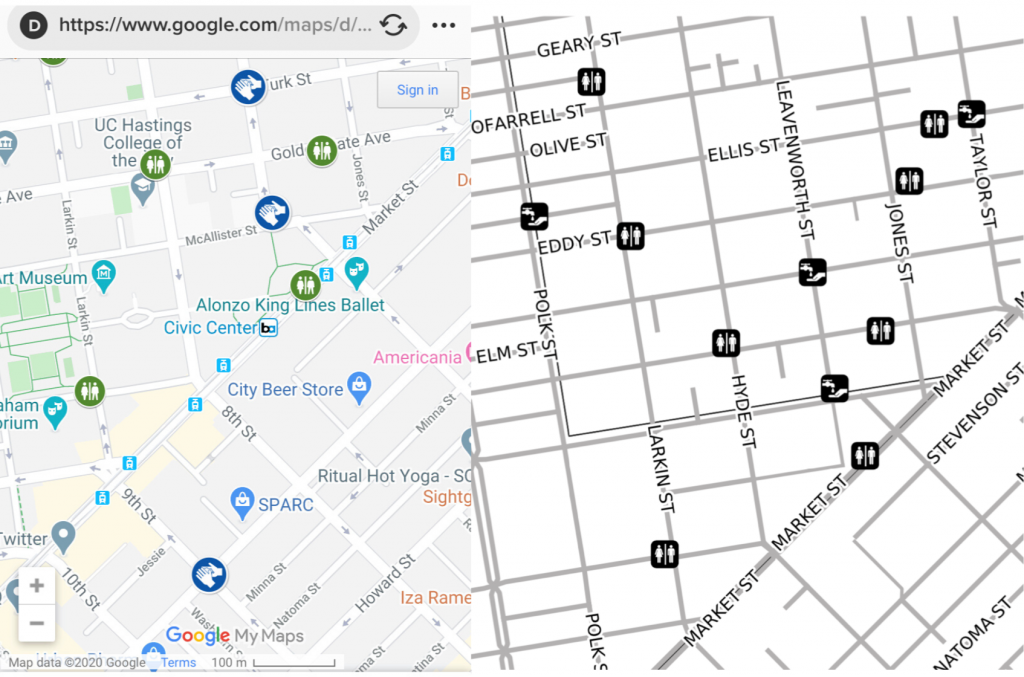 Here’s a complete list of the pit stops and hand-washing stations in San Francisco. We’ll be making more maps in the next few days to cover the whole city. San Francisco Public Press has a fantastic rundown of the conditions of them, check it out.
