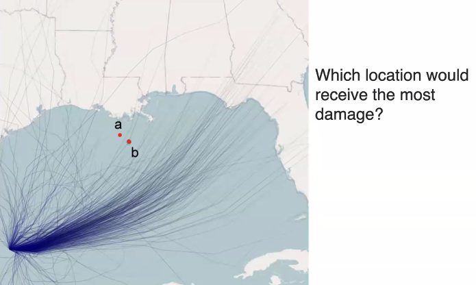 The hurricane diagram on the right shows “damage radiance” over a period of time, nudging people towards better judgement about staying put or evacuating. Though the lines don’t fix everything: Padilla says that people tend to misinterpret the danger, thinking if the line falls right on a point, it’s less dangerous than if the point falls inside.